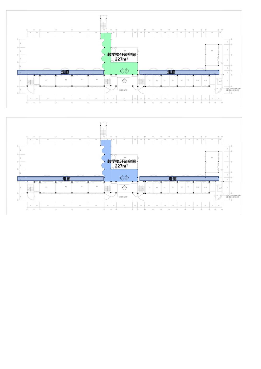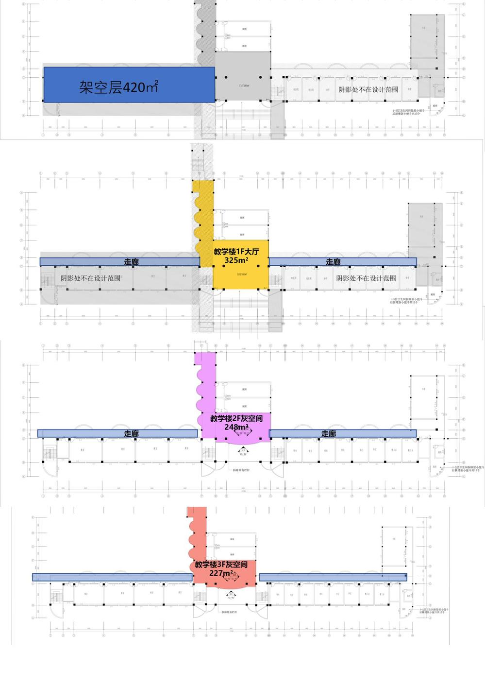 含教学楼1F架空层、教学楼1F大厅、教学楼2楼走廊、教学楼2F灰空间等区域设计(阴影区域不在设计范围),需完成项目背景解读、区位分析、空间现状诊断、平面布局设计、人流动线设计、空间文化定位、整体风格定位、效果图/平面方案图设计、施工图(平面/立面/节点大样)设计等成果。